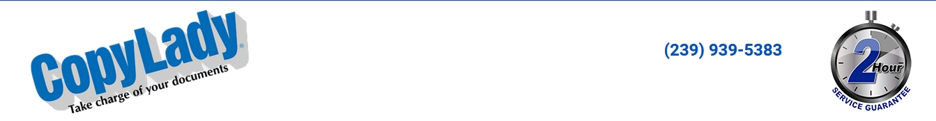 CopyLady: Proudly serving Naples, Bonita Springs, and SouthWest Florida since 2002!Let CopyLady take your business to the next level of document management!At CopyLady, We carry Multifunction Printers from major brands such as Epson, Kyocera, and KIP.We also service other major brands, such as HP, OKI, Canon, Xerox, Brother, and Ricoh.Need a toner, ink or other component for an existing machine? Can't find it anywhere else? We can help you!CopyLady is the ONLY dealer in Florida with a 2-Hour service guarantee!When your copier runs into a problem, that can bring your business to a screeching halt. No one has time for downtime!With CopyLady's 2-Hour service guarantee, you can have confidence that your business will be back up and running in no time!Because we at CopyLady know that you cannot afford ANY downtime, We make sure that your copier stays in tip-top running shape. Our team of highly trained copier technicians are always ready to help when the call comes in, You can also get quick assistance fromour help desk! Do you have a question about something on your copier or printer? Need some assistance with a feature? Just give CopyLadya call, and our highly knowledgeable help desk technicians can assist you within minutes!. Worried about toner costs? We got you covered!Gone are the days of having to take up space in your office with a stock of toner. With CopyLady's revolutionary Toner Replenishment System (TRS),You will never have to worry about being out of toner, or having to take time out of your busy day to call for toner. Once TRS tells us you are low on a toner, One of our technicians will simply deliver a fresh toner directly to your office. We carry a full selection of toners and inks in our Fort Myerswarehouse, so you NEVER have to wait for shipping!By the way, did we mention that this is included FREE with your CopyLady service agreement? Well, it is! NEVER pay for toners again!Need to print REALLY BIG? We can help you with that! Whether it's a poster, a banner, or even blueprints, let CopyLady get you set up with a plotter that will let you exceed your wildest creative ambitions! With sizes up to 44 inches, There's no limit to what you can create!Are you ready to take your productivity to the next level? What are you waiting for? Call us at 239-939-5383and let our experienced sales team set you up with the copier that YOUR business needs!Call CopyLady Today at 239-939-5383Serving Naples, Bonita Springs, and all of Southwest Florida.